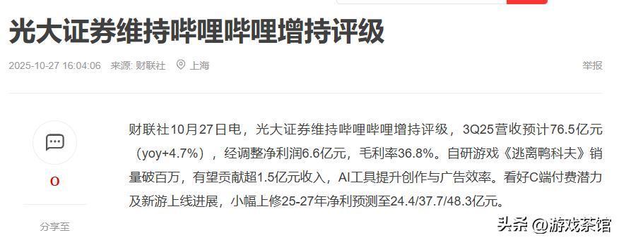 在《逃离鸭科夫》销量破百万时,光大证券发布研报估算该游戏有望贡献超1.5亿元的收入,维持B站“增持”评级。