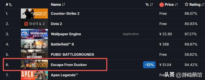 据SteamDB,《逃离鸭科夫》发售后的首个周末同时在线人数就突破20万,上周末已突破30万。该游戏同时在线人数已经超越了《Apex英雄》《三角洲行动》等热门PvP游戏,显示有着极高的热度。